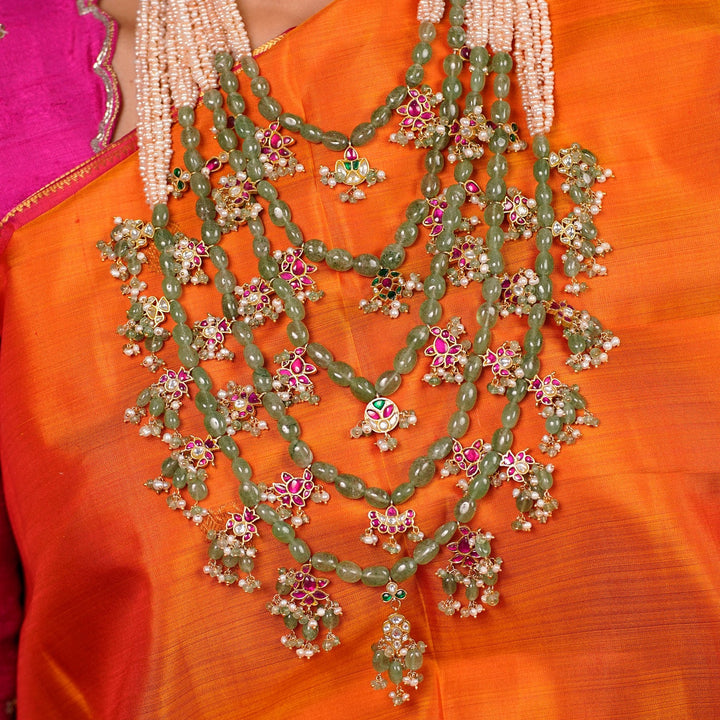 Experience the epitome of royal jewelry with the Vasundhara kundan Emerald Satlada. This magnificent five-row necklace is a true statement piece, perfect for the most grand occasions. It features a...