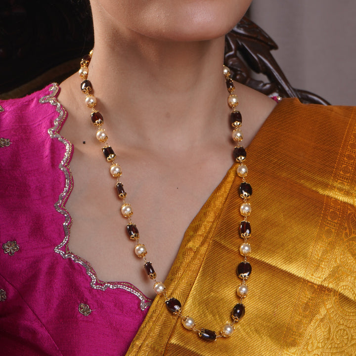 Elevate your style with the Kanaka Moti Crown Chain, featuring a combination of pearl and brown beads with elegant gold crowning. This sophisticated piece adds a touch of timeless elegance...