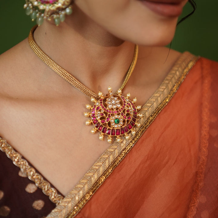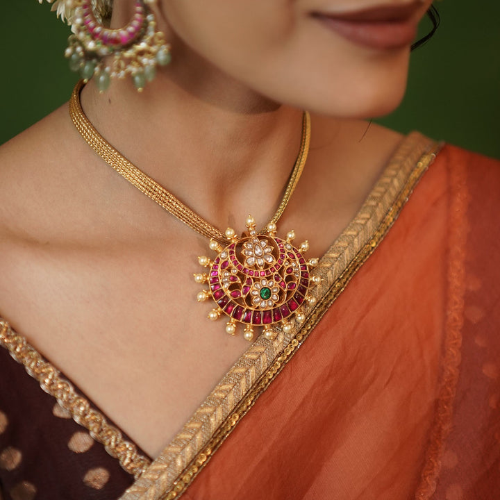 Adorn your neckline with our magnificent Chand Shaped Pendant, a harmonious blend of traditional artistry and dazzling sparkle. This captivating pendant features a delicate central white flower motif, shimmering with...