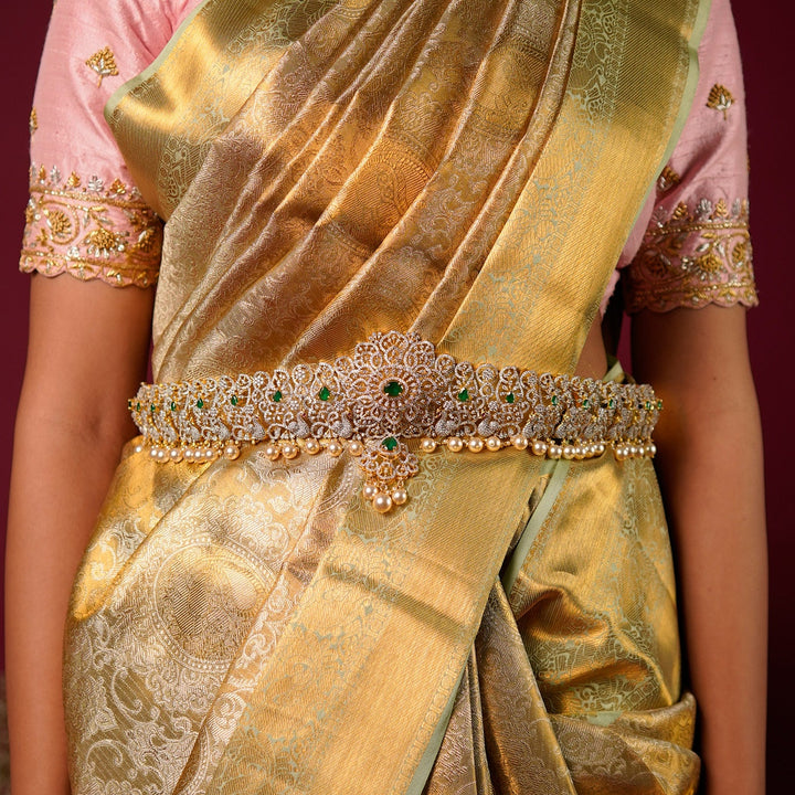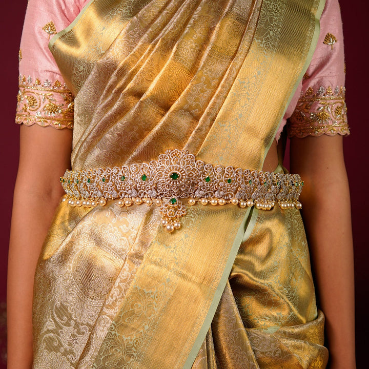 Cinch your saree with the breathtaking elegance of the Grand CZ Diamond Look Hip Belt (Vaddanam). This magnificent waist belt is a contemporary masterpiece, featuring the dazzling brilliance of zircons...