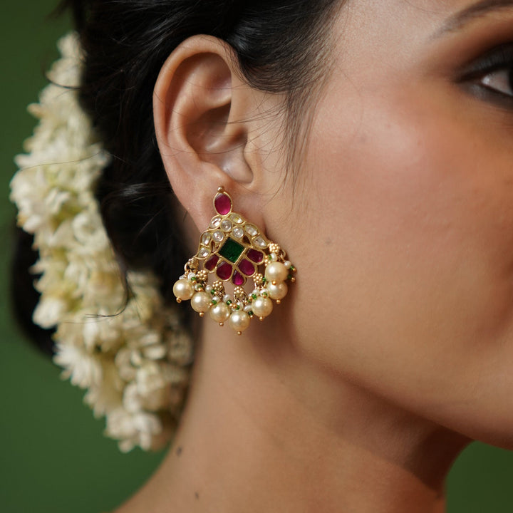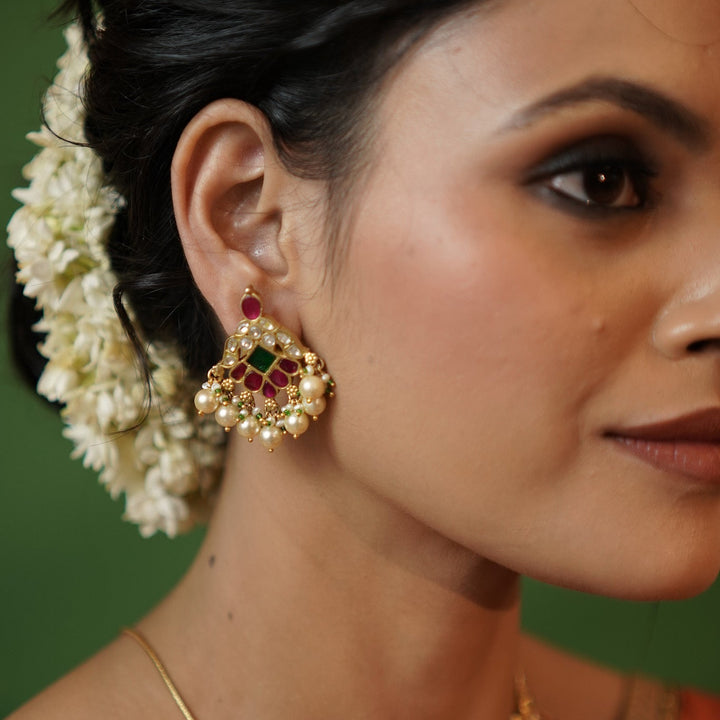 Celebrate spiritual beauty with Vibhuti Kundan Earrings. These traditional earrings feature exquisite Kundan work, symbolizing purity and divine grace.