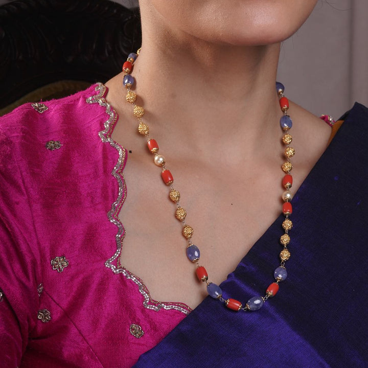 The Lavanya Chain blends subtle elegance with vibrant charm, featuring alternating gold-plated balls, soft light violet beads, radiant pearls, and coral accents. Handcrafted in 92.5 pure silver and finished with a...