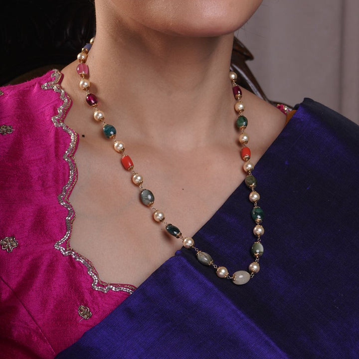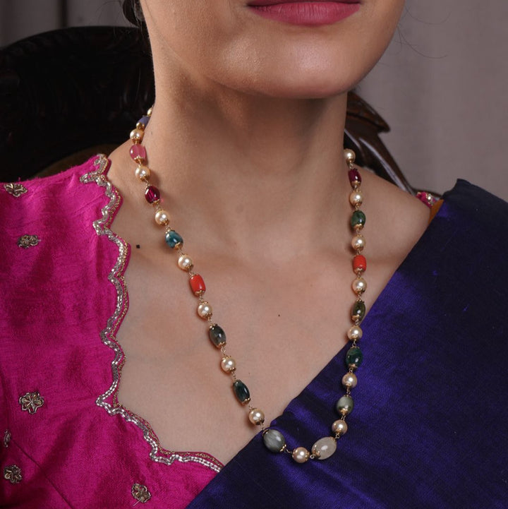 Elevate your elegance with the Saanvi Multicolor Pearl Harmony Chain, a vibrant medley of pearls, light violet, ruby, light pink, grey, sky blue beads, and corals, all delicately alternated and strung...