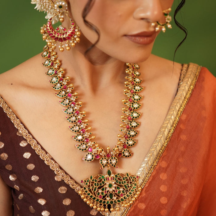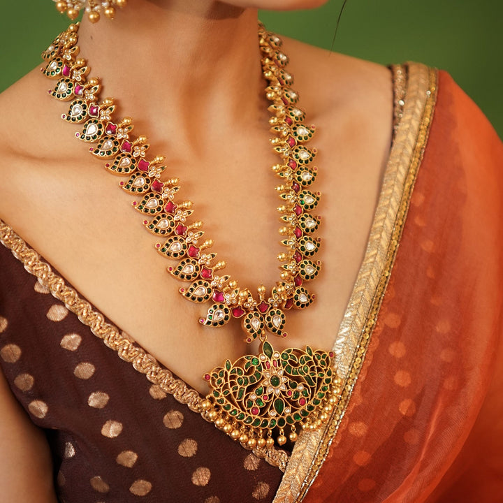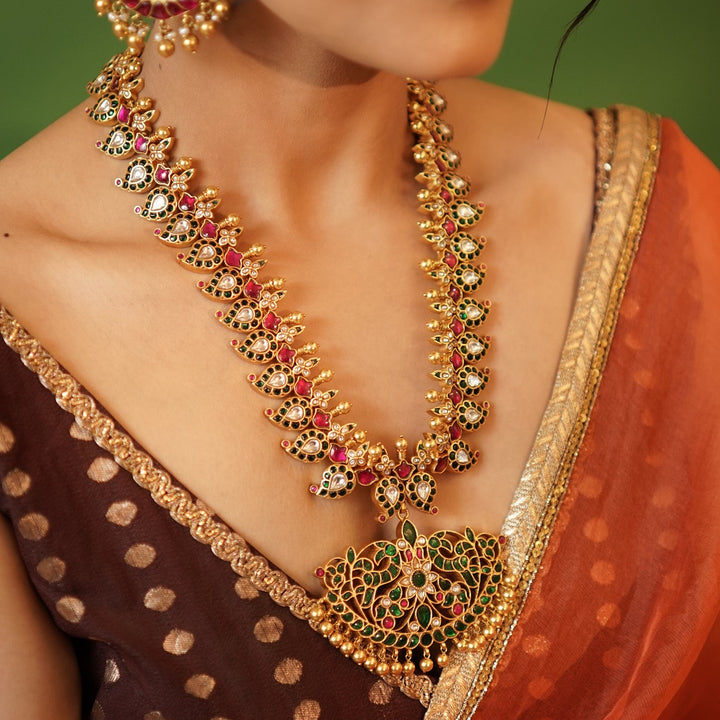 This exquisite long necklace features beautifully crafted mango (Manga) motifs, meticulously adorned with vibrant semi-precious Kundan stones and lush emeralds. Each Kundan piece is intricately strung with radiant gold-coated balls,...