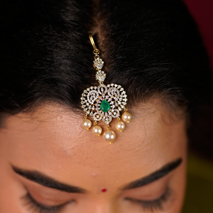 Regal CZ Maang Tikka with Emerald Doublet & Pearl Drops