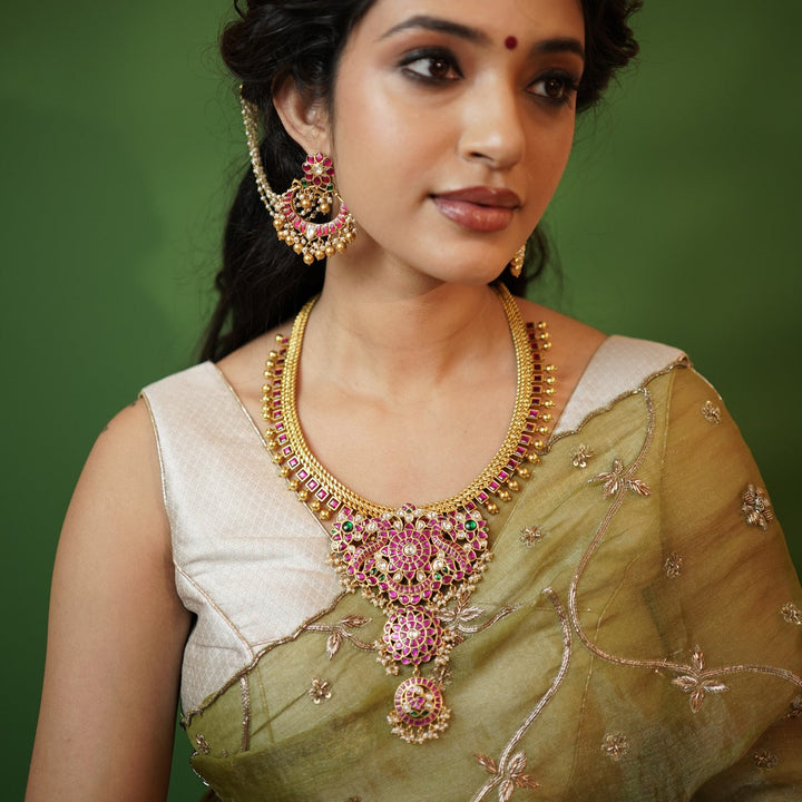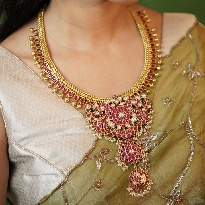 Elevate your ethnic ensemble with this exquisite Jalebi-style two-sided necklace, handcrafted in 92.5 sterling silver with a luxurious 22ct gold polish. Featuring a detachable Kundan pendant and adorned with Swarovski...
