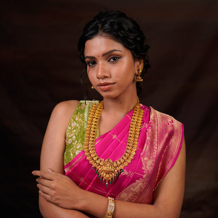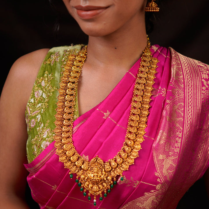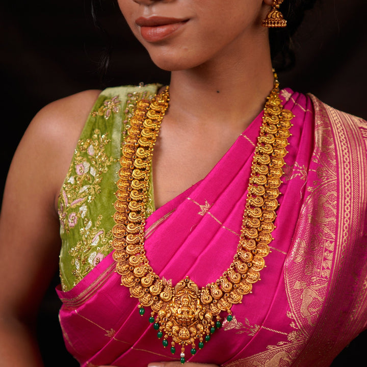 Embrace the sacred and regal heritage of South Indian jewelry with this magnificent Lakshmi Kaasu Haaram (Coin Necklace). This long necklace is a powerful symbol of prosperity and divine blessing,...