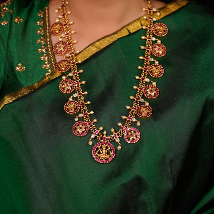 Elevate your traditional look with the stunning Mahalakshmi Kundan Bottumala, a magnificent piece of South Indian heritage jewelry. This exquisite long necklace, crafted from premium 92.5 sterling silver, boasts a...