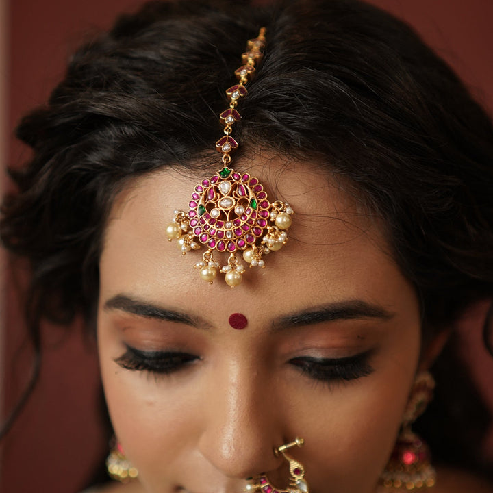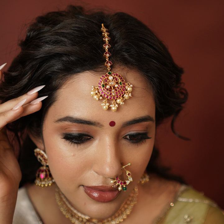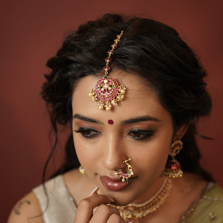 The Rangika Kundan Maang Tikka showcases an elegant fusion of pink and green semi-precious Kundan stones, delicately accented with pearls and green bead hangings. Crafted from 92.5 pure silver with...