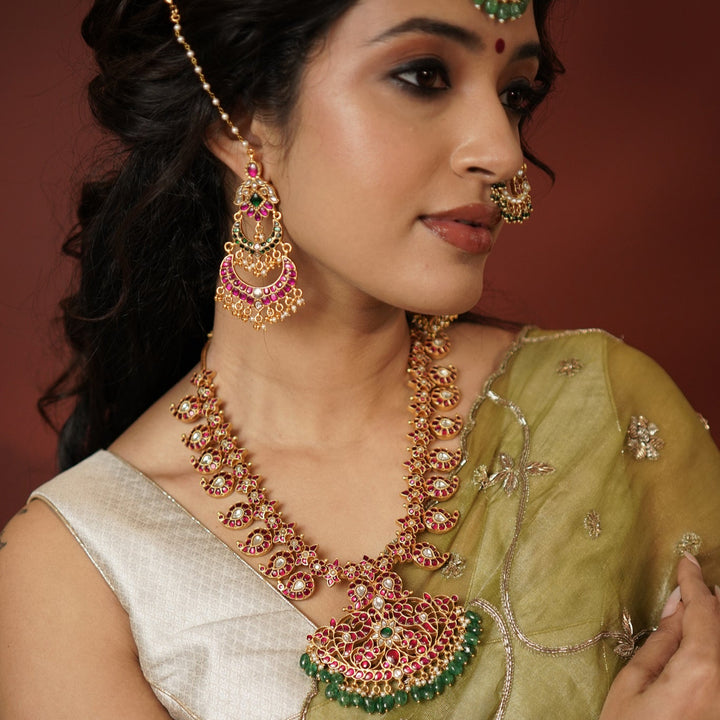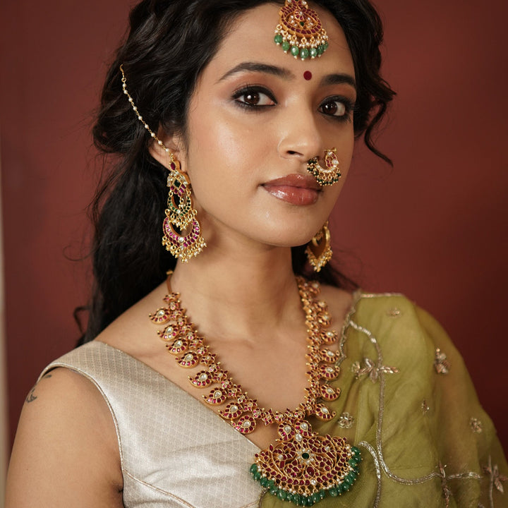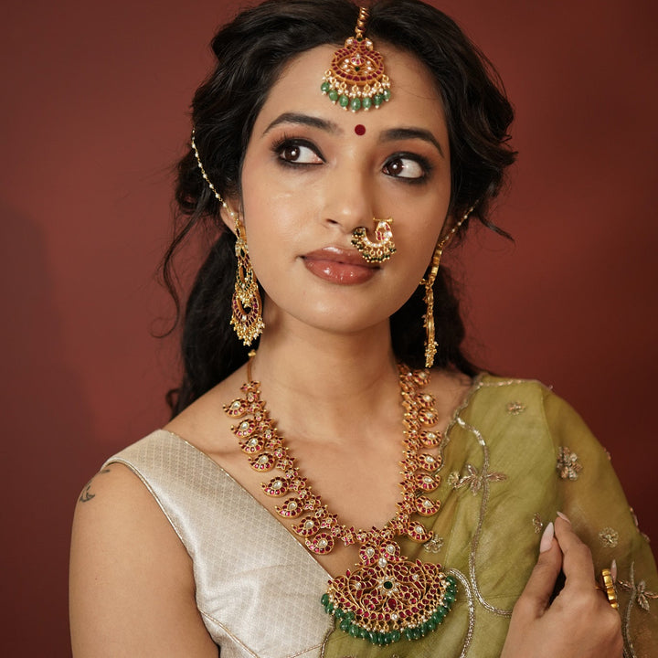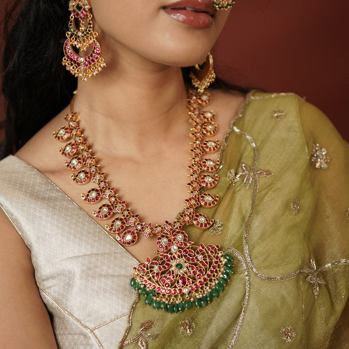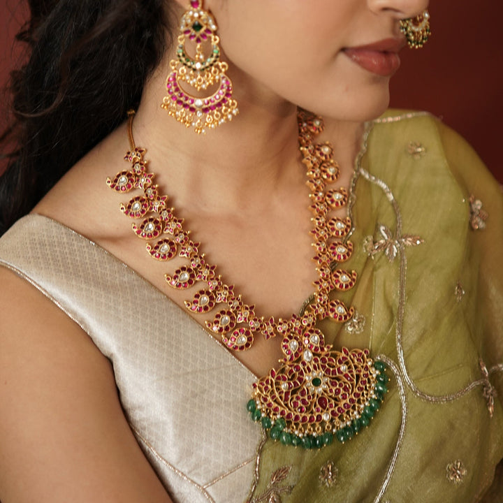 Grace your festive look with this exquisite mango mala, meticulously handcrafted in 92.5 silver and finished with a luxurious 22ct gold polish. Embellished with vibrant semiprecious Kundan stones and delicately...