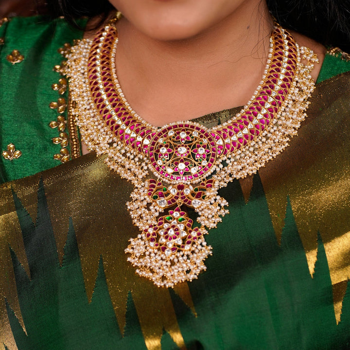 Dazzle in the majestic heritage of India with the "Rajwada" Kundan Ruby Pearl Choker Necklace. This breathtaking piece is designed to exude opulence, featuring a broad choker band and a...