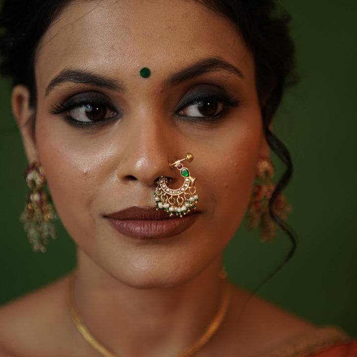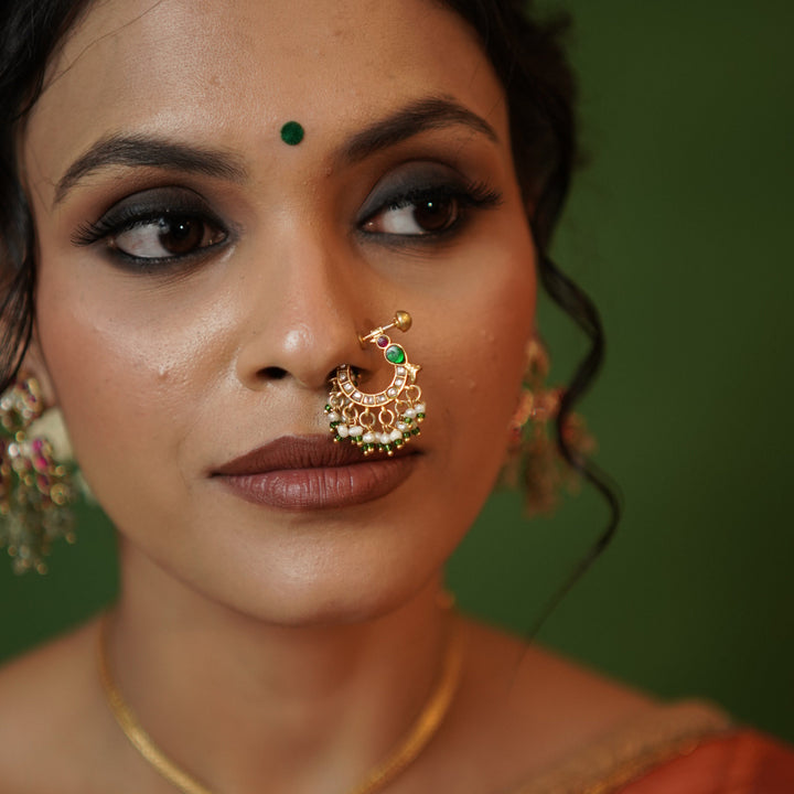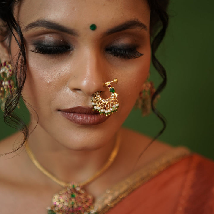 Elevate your ethnic elegance with the Emerald Grace Kundan Nose Pin, designed in a graceful bird motif. Adorned with green and white semi-precious Kundan stones, and finished with lustrous pearls...