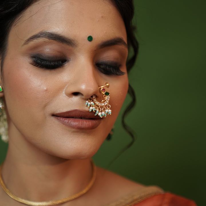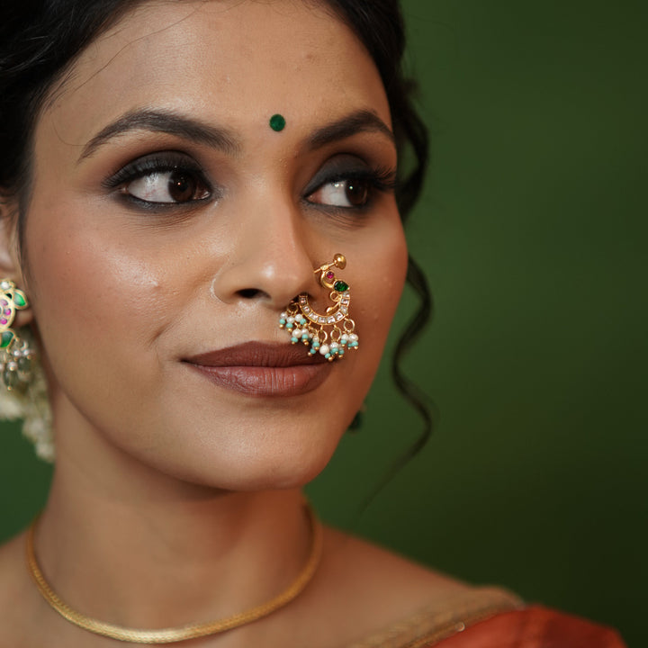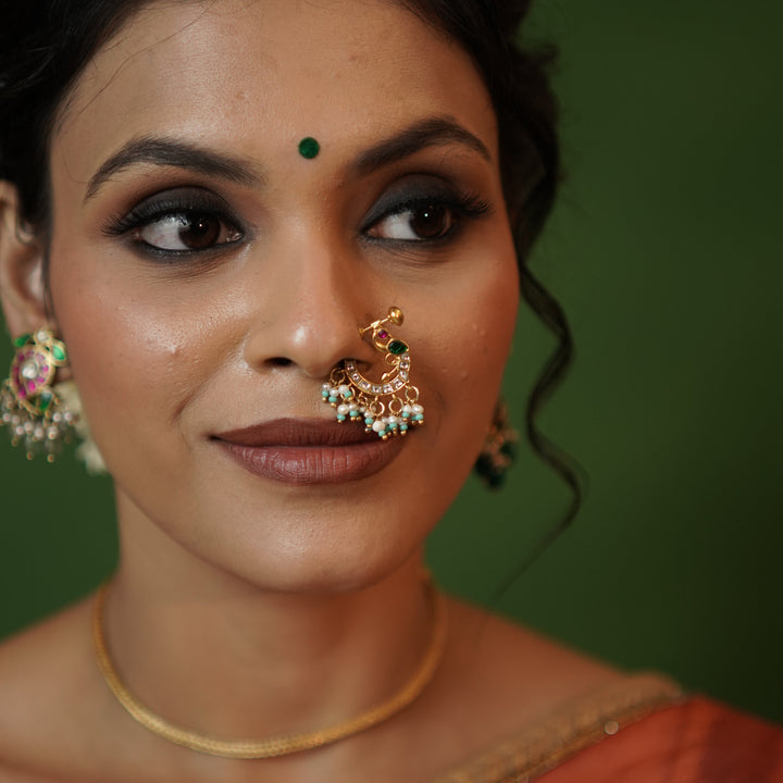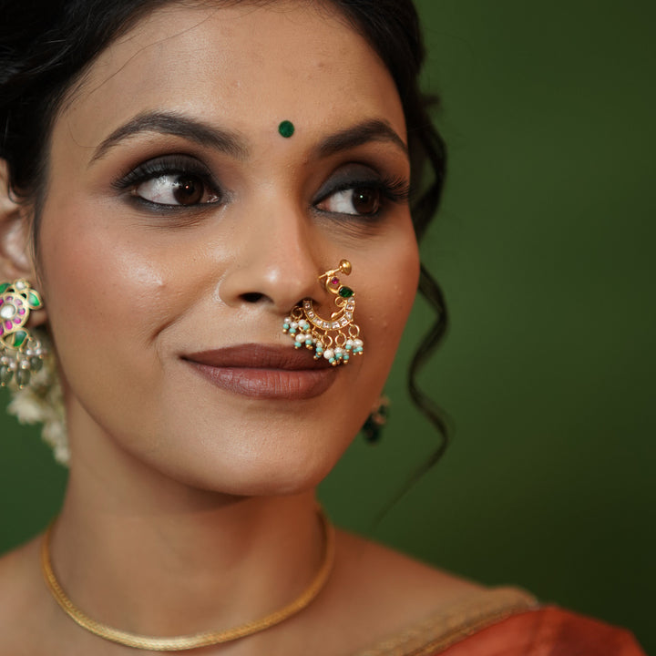 Elevate your ethnic elegance with the Sky Song Kundan Nose Pin, designed in a graceful bird motif adorned with green and white semi-precious Kundan stones. Accented with delicate pearl and...