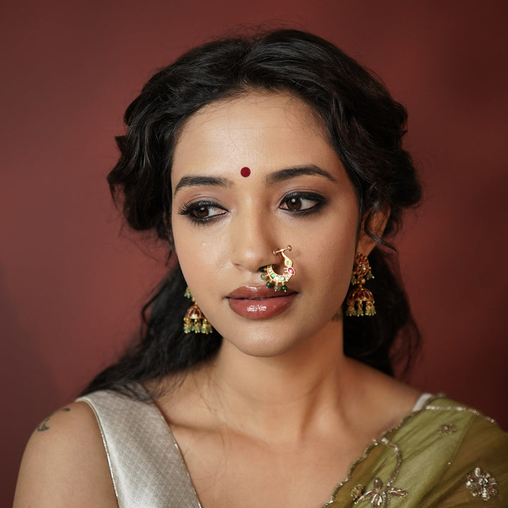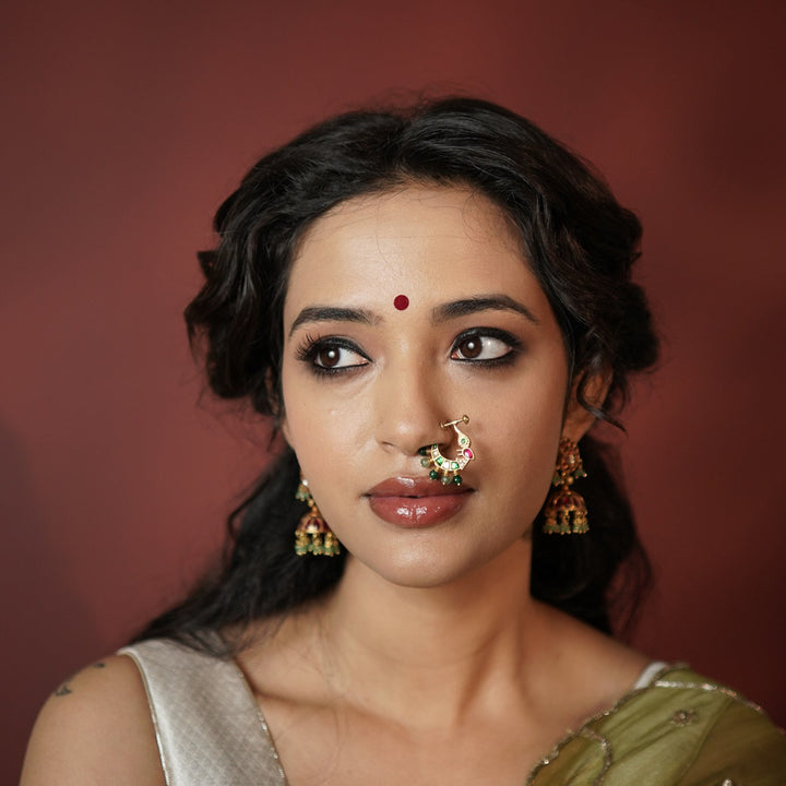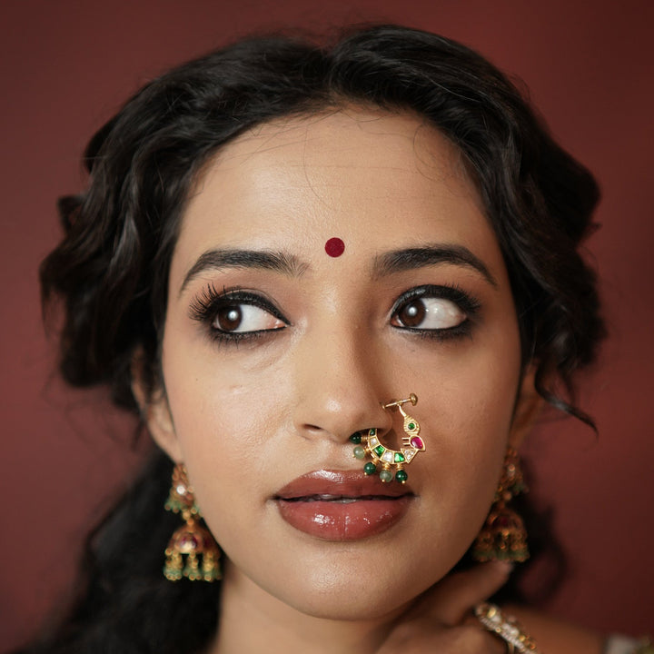 Add a touch of timeless elegance with the Peacock Grace Kundan Nose Pin, intricately designed with green and white semi-precious Kundan stones in a classic peacock motif. Finished with delicate...