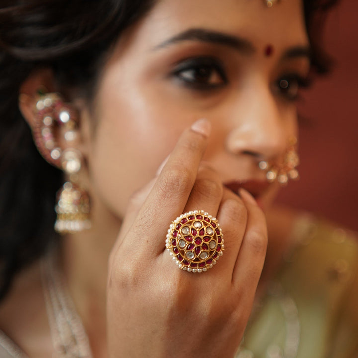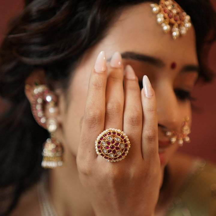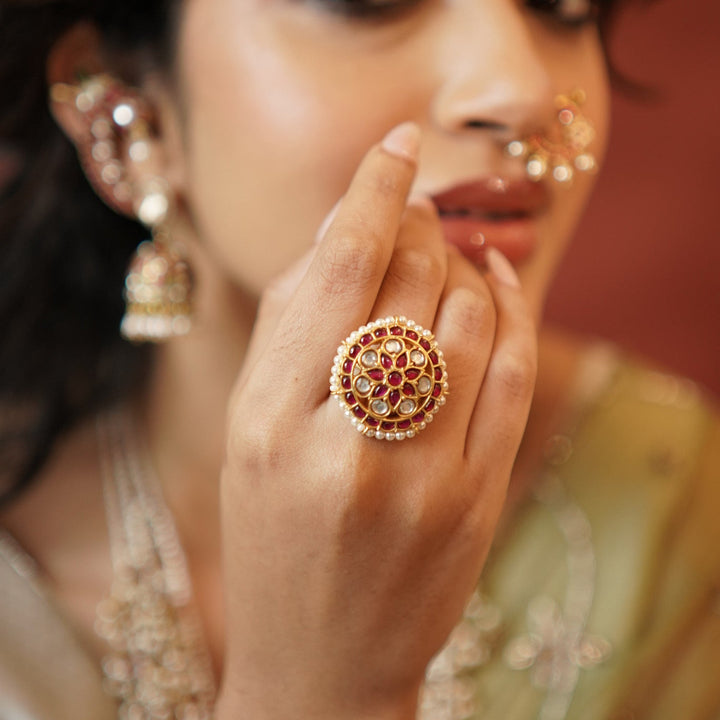 Adorn your fingers with the timeless beauty of the Kundan Roja Pearl Ring, featuring rich red and white semi-precious kundan stones surrounded by elegant pearl accents. Crafted in 92.5 pure...