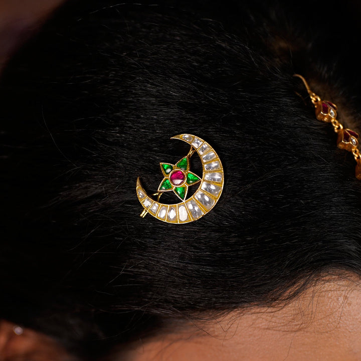Regal Kundan Sun and moon Hair pin - 92.5 Silver with 22K Gold Finish Adorn your traditional updo or braid with the exquisite Kundan Ruby Floral Billai (decorative hair...