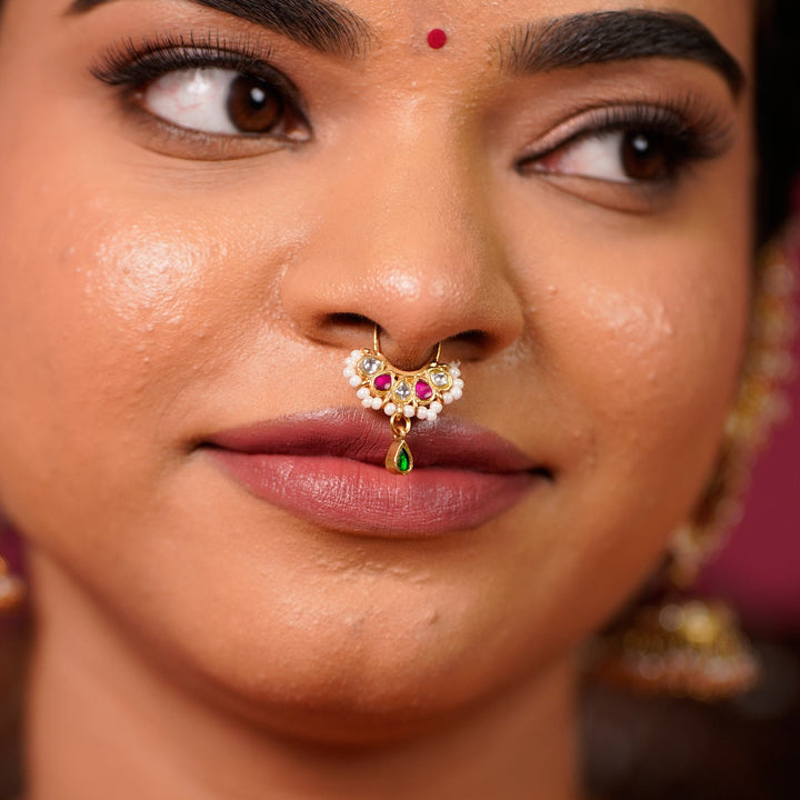 Elevate your traditional attire with this magnificent Kundan Nose Ring (Nath/Nathiya), a timeless accessory crafted to add a touch of regal elegance to any look.