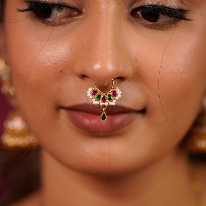 Embrace the timeless beauty of a traditional Indian bride with the exquisite Kundan Nath (Nose Ring). This elegant piece of nose jewelry is designed to be worn on special occasions, adding...