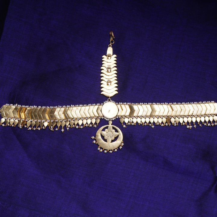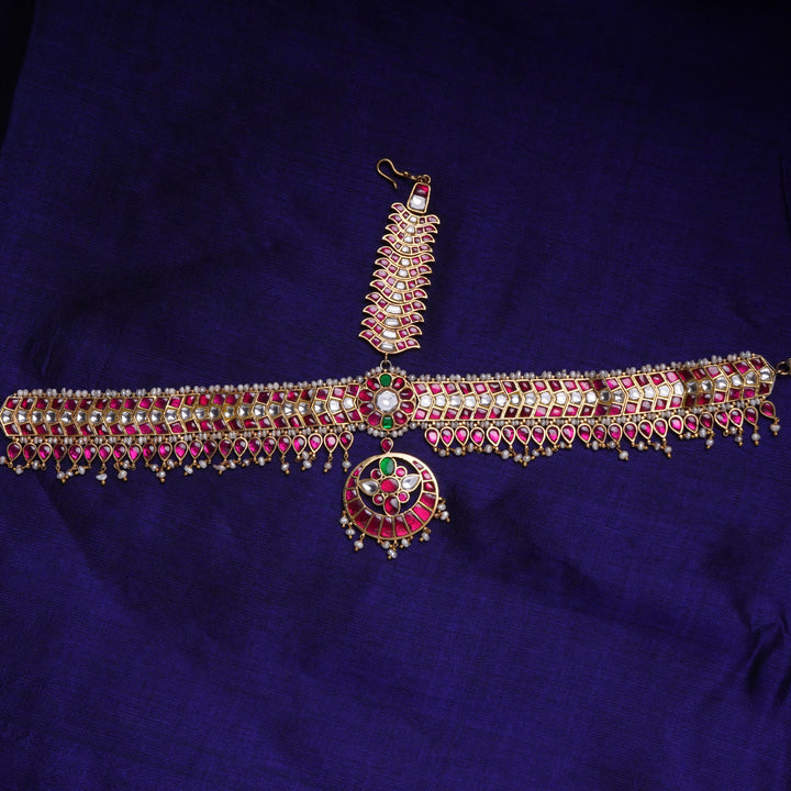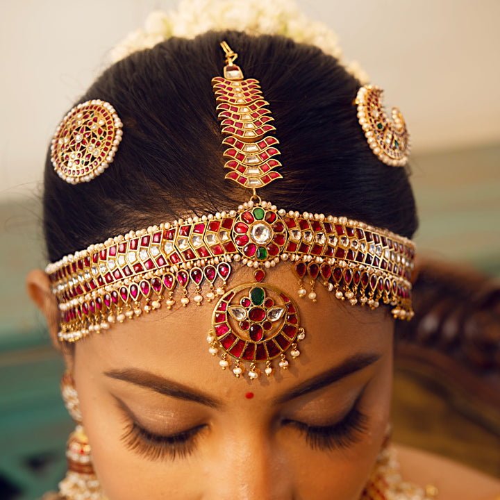 This regal headpiece features a captivating blend of semi-precious Kundan stones in white, red, and green hues, elegantly arranged in classic temple-style motifs. The centerpiece mathapathi is accompanied by matching...