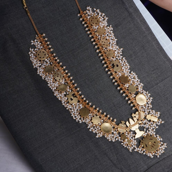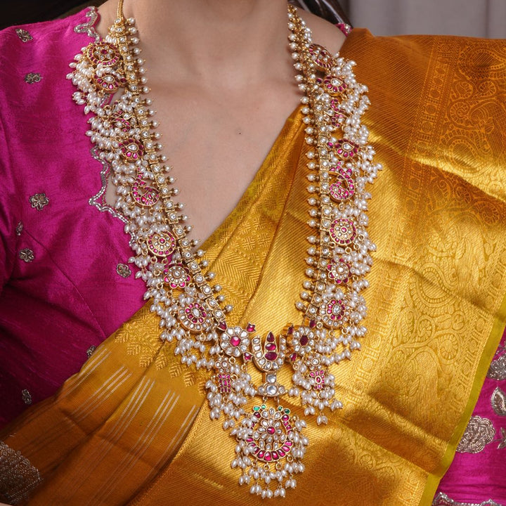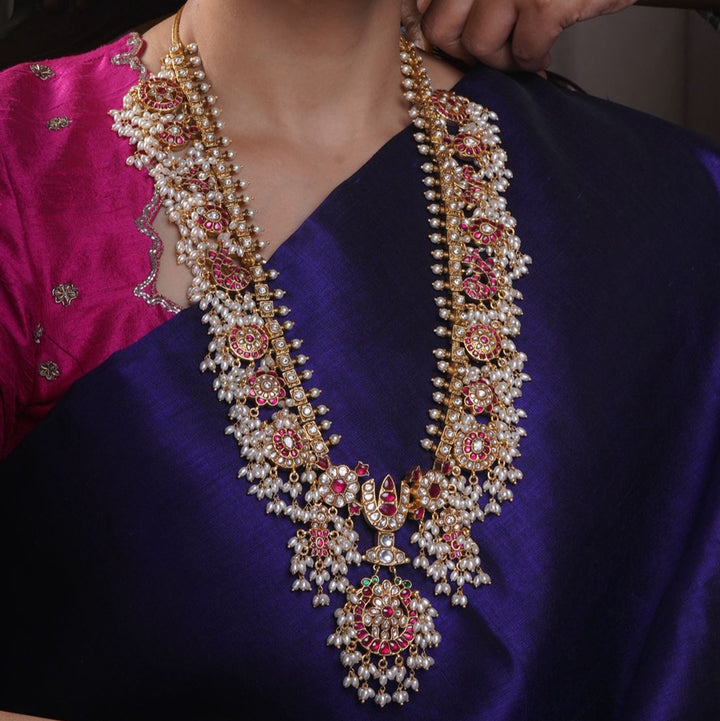 Traditional Balaji Guttapusalu necklace crafted in 92.5 silver with 22kt gold polish, featuring red and white Kundan semi-precious stones, floral motifs, fish-shaped and round pendants, and rich rice pearl detailing ...