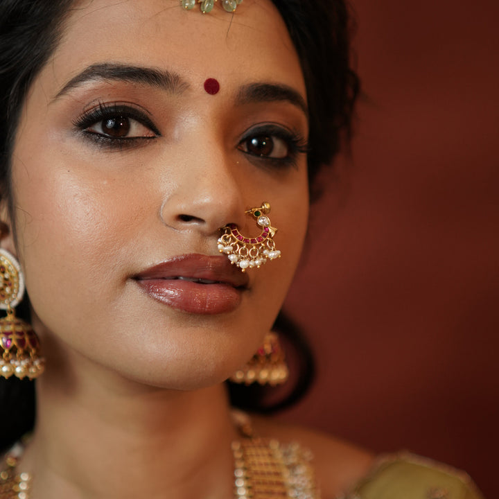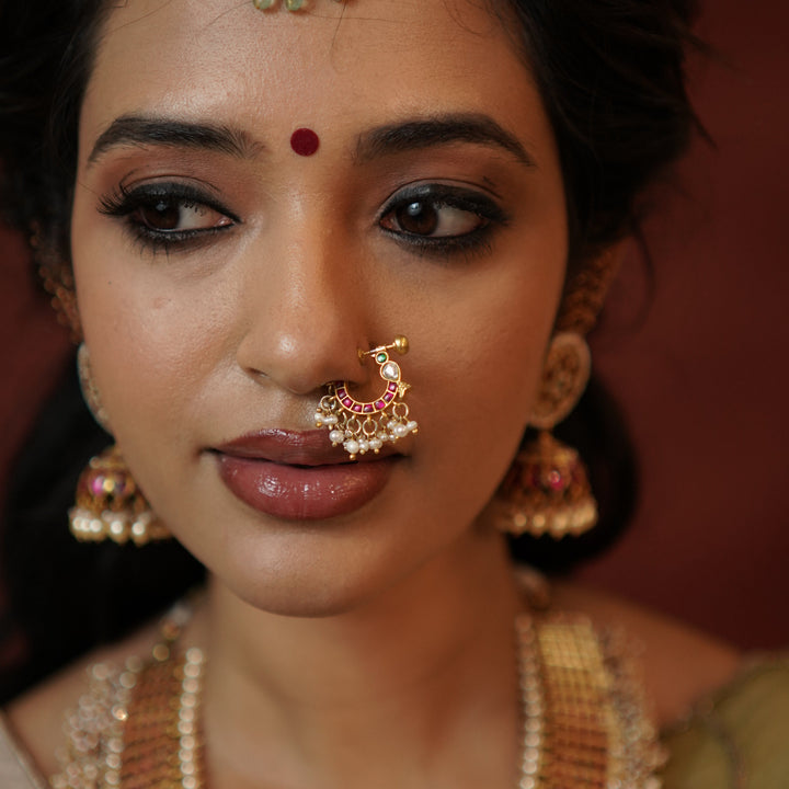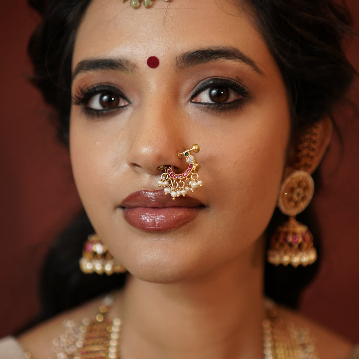 Elevate your ethnic charm with the Peacock Glow Kundan Nose Pin, featuring a majestic peacock design adorned with pink and white semi-precious Kundan stones. Finished with elegant pearl hangings, this...