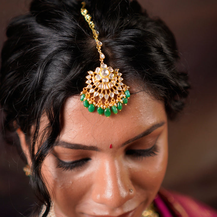 Adorn your crown with The Royal Emerald Chandbali Tikka, a magnificent statement piece steeped in tradition. Expertly crafted in premium 92.5 Sterling Silver and finished with a rich, durable 22-carat...