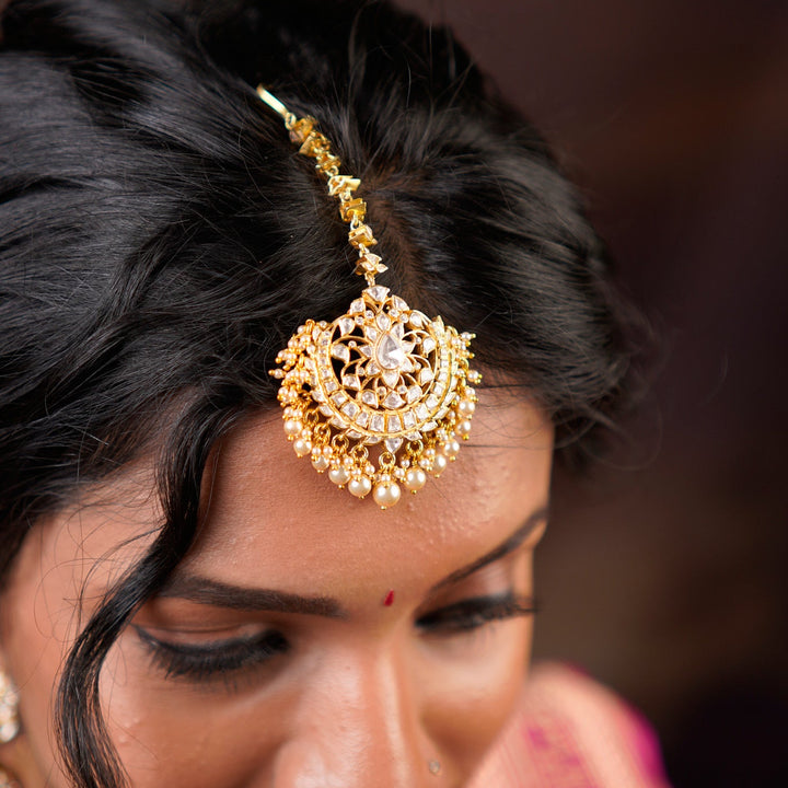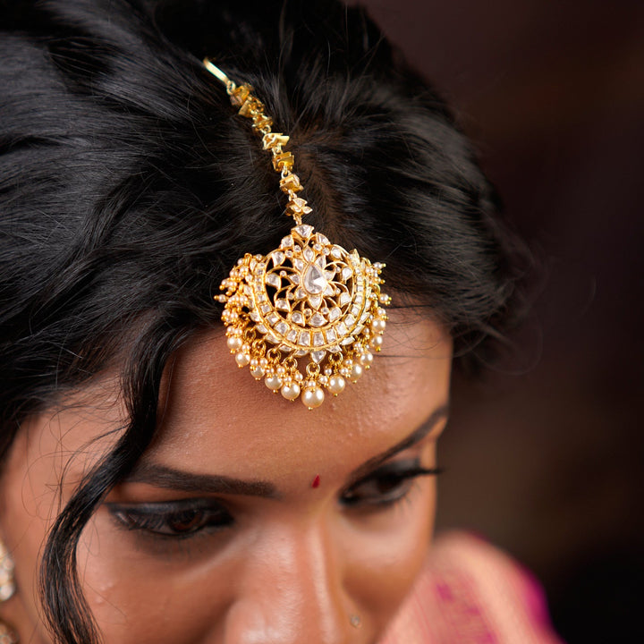 Adorn your forehead with the royal splendor of this Traditional Kundan Maang Tikka. This exquisite headpiece is an essential accessory in any bridal or festive ensemble, instantly framing the face...