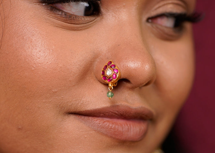 Add a sophisticated, traditional accent with the charming "Pushpa" Kundan Drop Nose Pin. This small, exquisite piece offers a beautiful blend of traditional Kundan work and a subtle drop feature,...