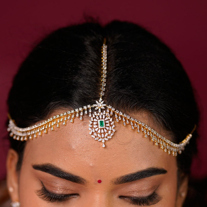 Diamond Look Zircon Maatha Patti with emerald stone.
