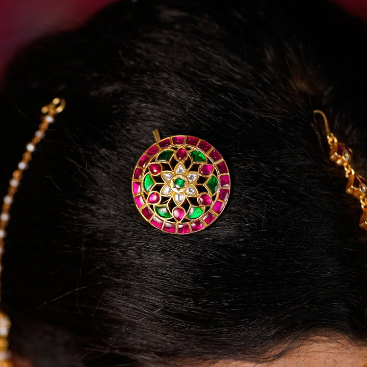 Adorn your tresses with the timeless elegance and celestial symbolism of our Kundan Sun & Moon Hair Pin Set. These intricate accessories, traditionally known as Surya (Sun) and Chandra (Moon)...