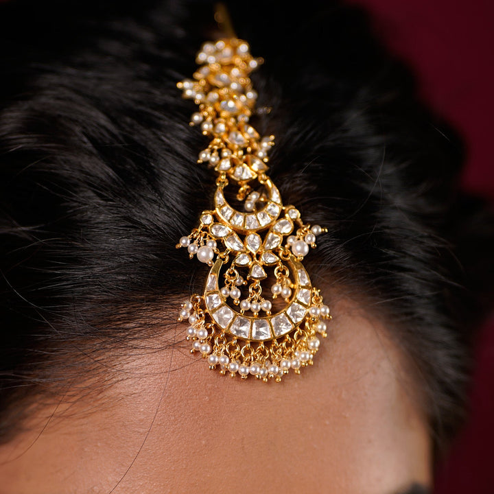 Dazzling Mossanite Polki Chandbali Maang Tikka with Pearl Drops