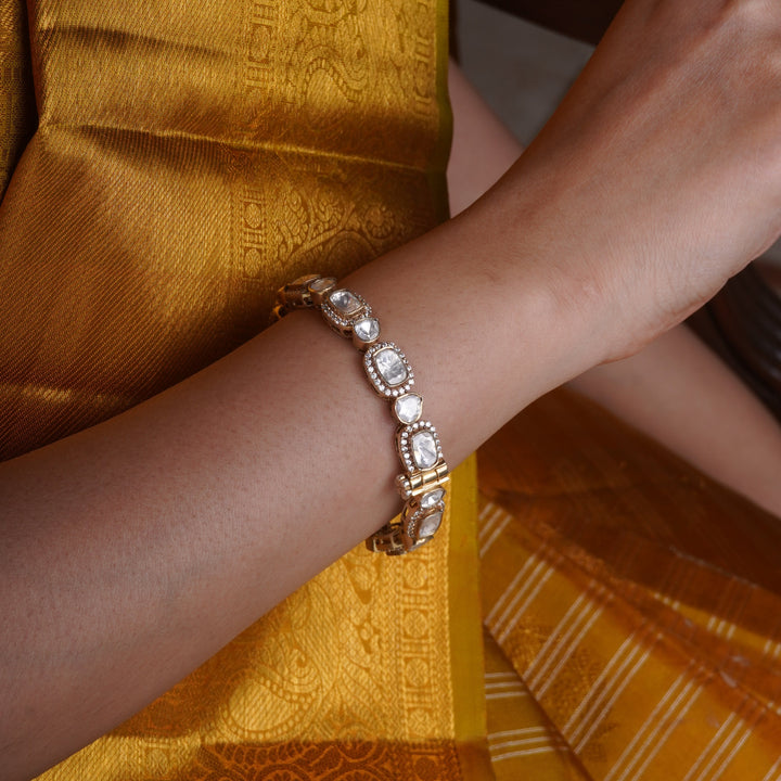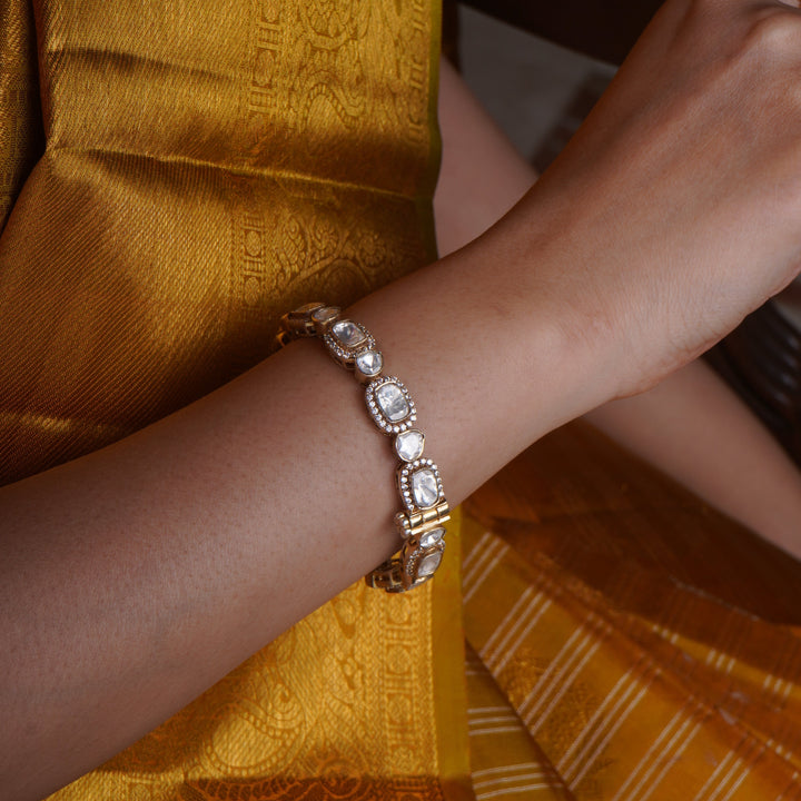 Experience unmatched grace with the Samaira Moissanite Radiance Bangle, a regal statement piece crafted in 92.5 pure silver and finished with a rich 22-carat gold polish. Featuring bold moissanite center...