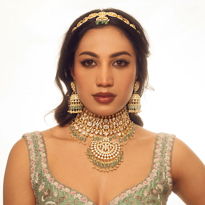 Step into a world of grandeur with the Elysian Dreams Moissanite Choker, an opulent masterpiece featuring dazzling moissanite stones set in intricate gold craftsmanship. Accented with serene green beads and finished...