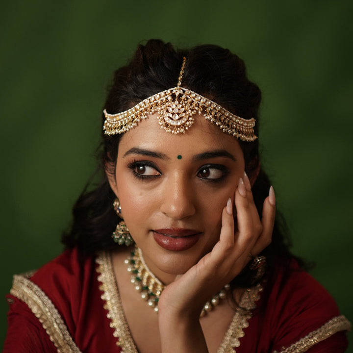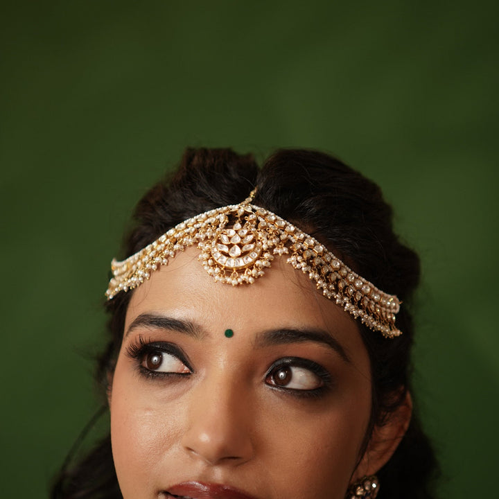 The Shubhra Moissanite Mathapatti is a radiant headpiece adorned with brilliant white moissanite stones and delicate pearl hangings for an ethereal bridal charm. Crafted in 92.5 pure silver with a...