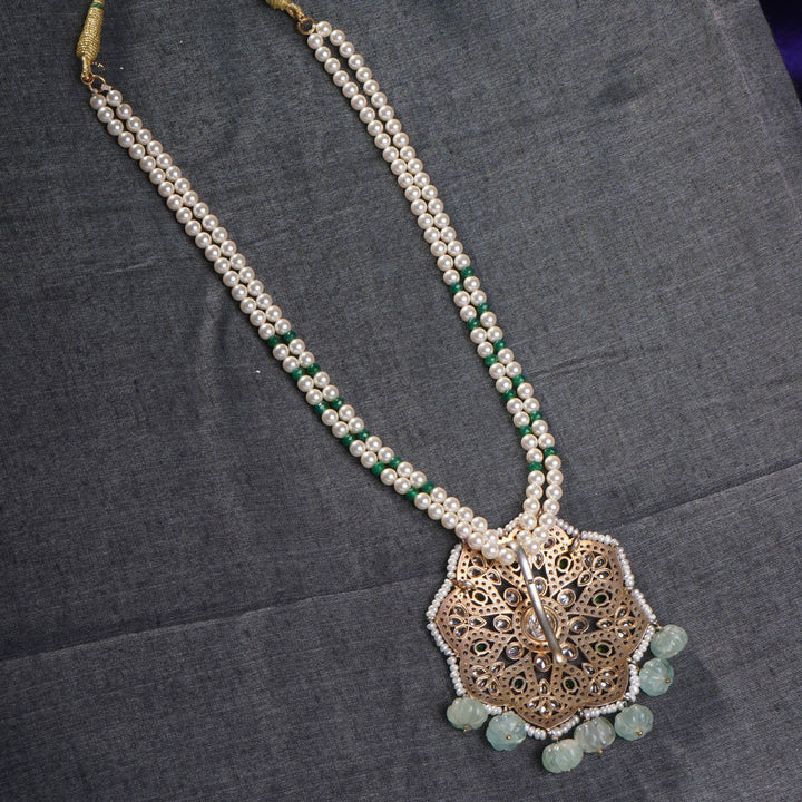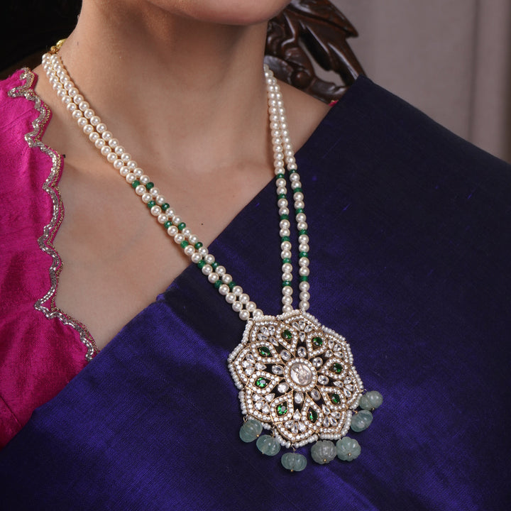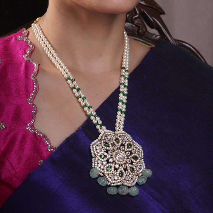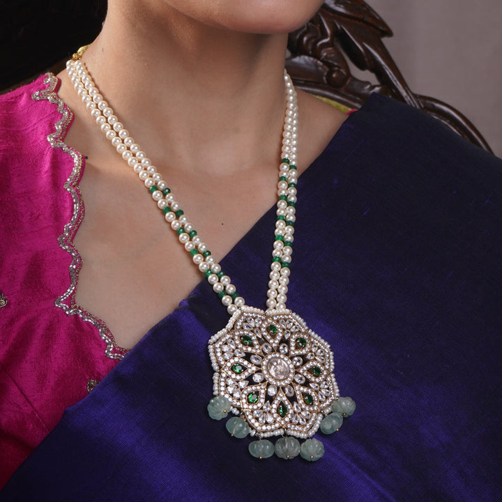 Crafted with radiant moissanite stones and lustrous pearls, this double-strand necklace features a grand central pendant encrusted with sparkling zircons and moissanite, arranged in a floral-inspired motif. The pendant is...