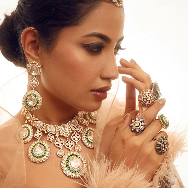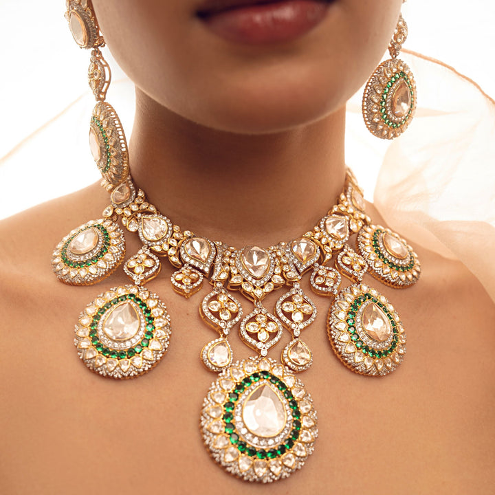 Drape yourself in timeless opulence with our Royal Aura Moissanite Necklace Set. Featuring luxurious pear-cut moissanite stones framed by a halo of dazzling zircons and emerald accents, this majestic design...