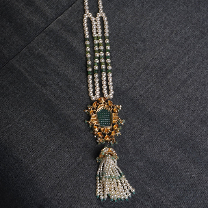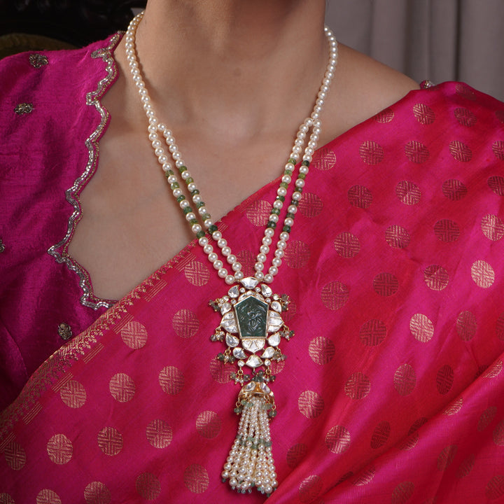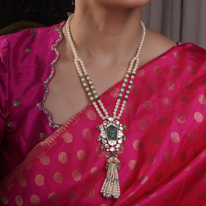 This exquisite piece features a dual-strand of lustrous pearls accented with green beads, leading to a grand centerpiece a carved emerald-like stone engraved with intricate floral motifs. Surrounded by sparkling...