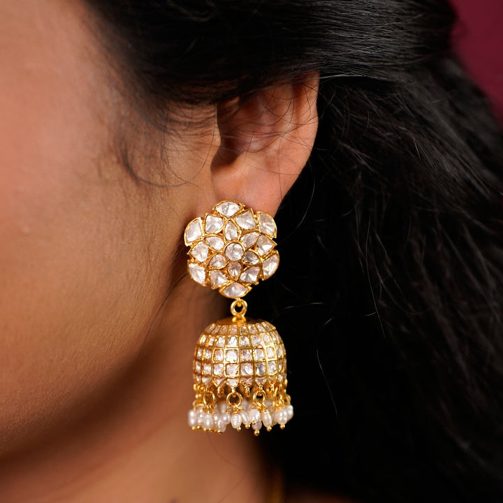 Adorn your ears with the majestic charm of the Devyani Polki-Style Moissanite Jhumkas. This classic pair of earrings features a brilliant fusion of traditional design and modern sparkle, perfect for...