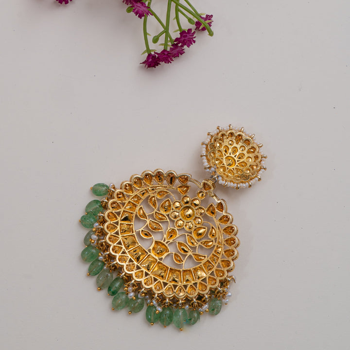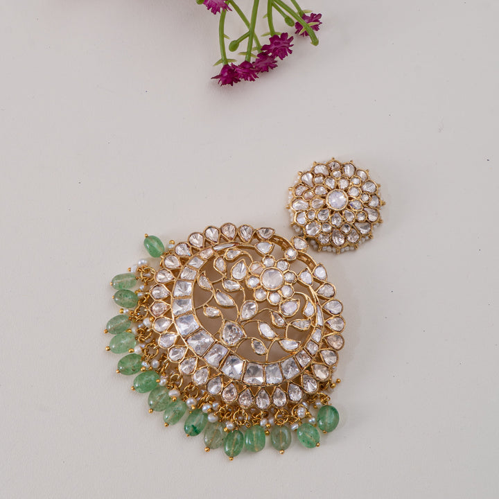 An absolutely stunning Chandbali-style pendant crafted in fine 92.5 Sterling Silver with a rich 22ct gold polish. This opulent piece features brilliant, uncut-style Moissanite stones that sparkle like diamonds, finished...