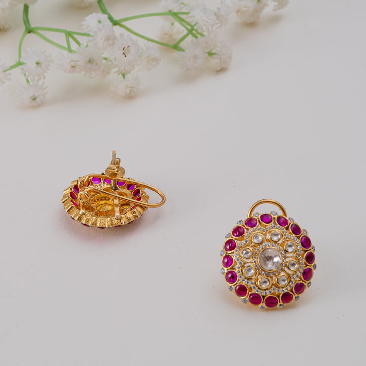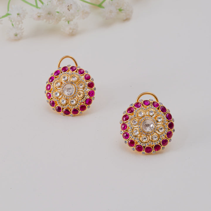 Add a regal charm to your look with these Ruby Halo Polki Stud Earrings, beautifully handcrafted in 92.5 sterling silver with 22ct gold polish. Featuring a sparkling Moissanite Polki centre...