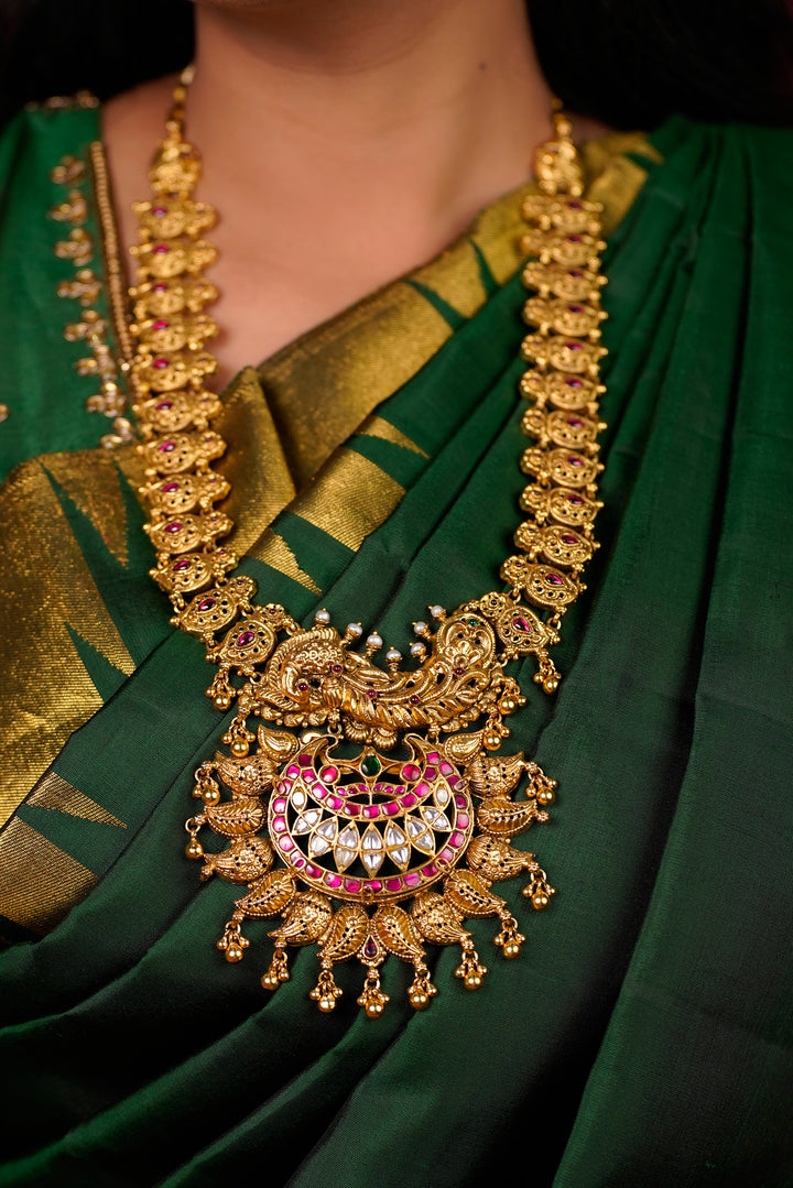 Darshana Necklace This stunning gold Nakshi temple necklace with Goddess imagery reflects the essence of divine elegance and is perfect for cultural events.