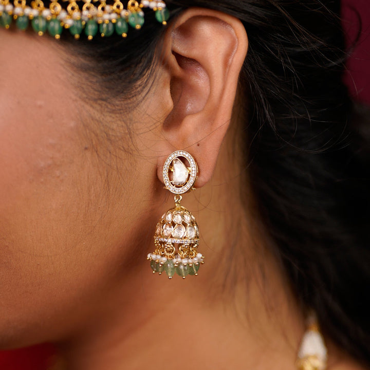 Elevate your ethnic jewelry collection with these exquisite small jhumkas, a perfect fusion of traditional grandeur and modern brilliance. Handcrafted with meticulous care, these earrings feature dazzling Moissanite stones set...