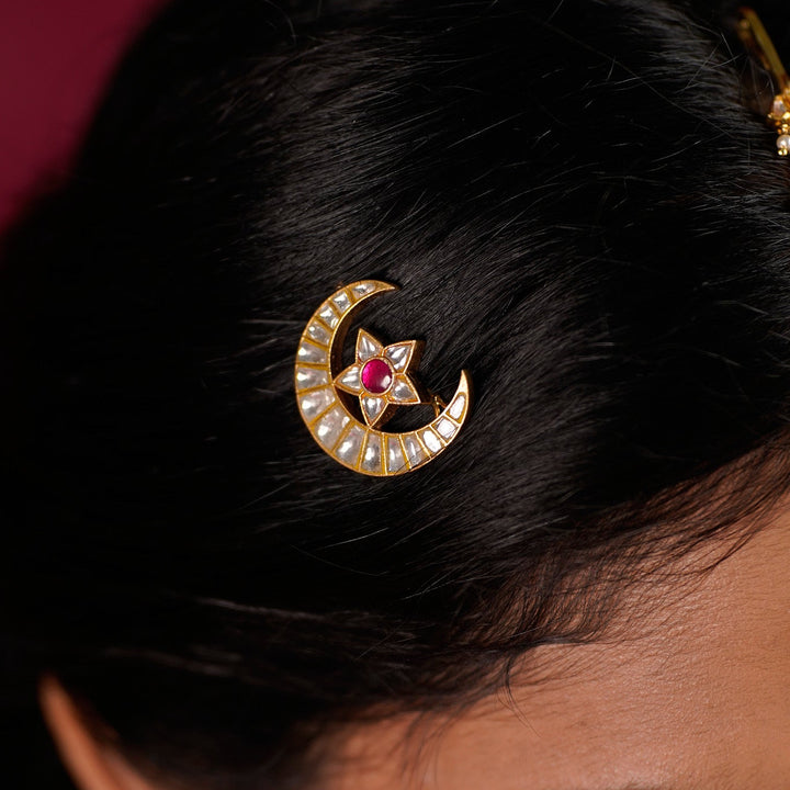 Shine like the cosmos! ✨ Our Chandra-Surya Kundan Hair Pins (Set of 2) feature classic Sun and Moon designs with stunning Kundan stones and ruby accents. Crafted in 92.5 Sterling...