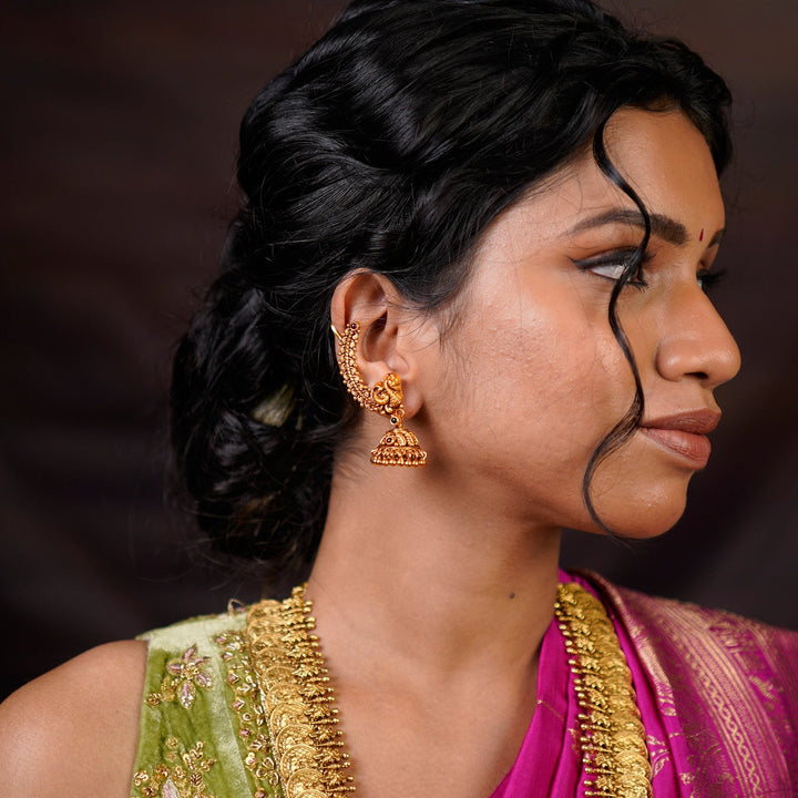 Divine Splendor: The Traditional Temple Jhumka Ear Cuff Embody the timeless grace of South Indian heritage with this magnificent Temple Jhumka Ear Cuff, also known as a Karn Phool or Bail...
