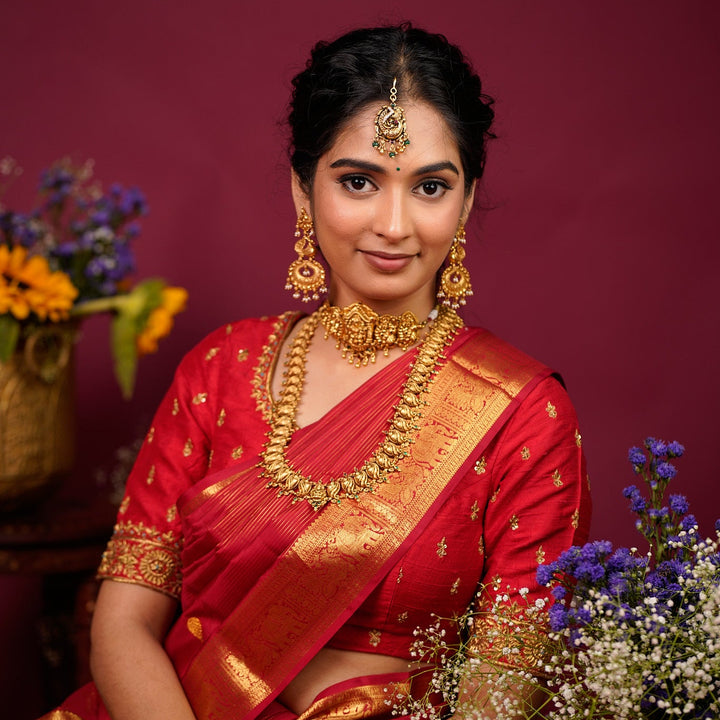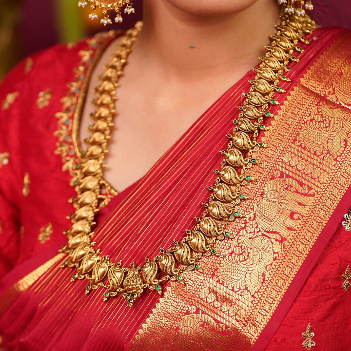 Embrace the timeless elegance of tradition with the Kamala Antique Gold Temple Mango Haaram. This exquisite long necklace is a faithful representation of classic South Indian temple artistry, renowned for...