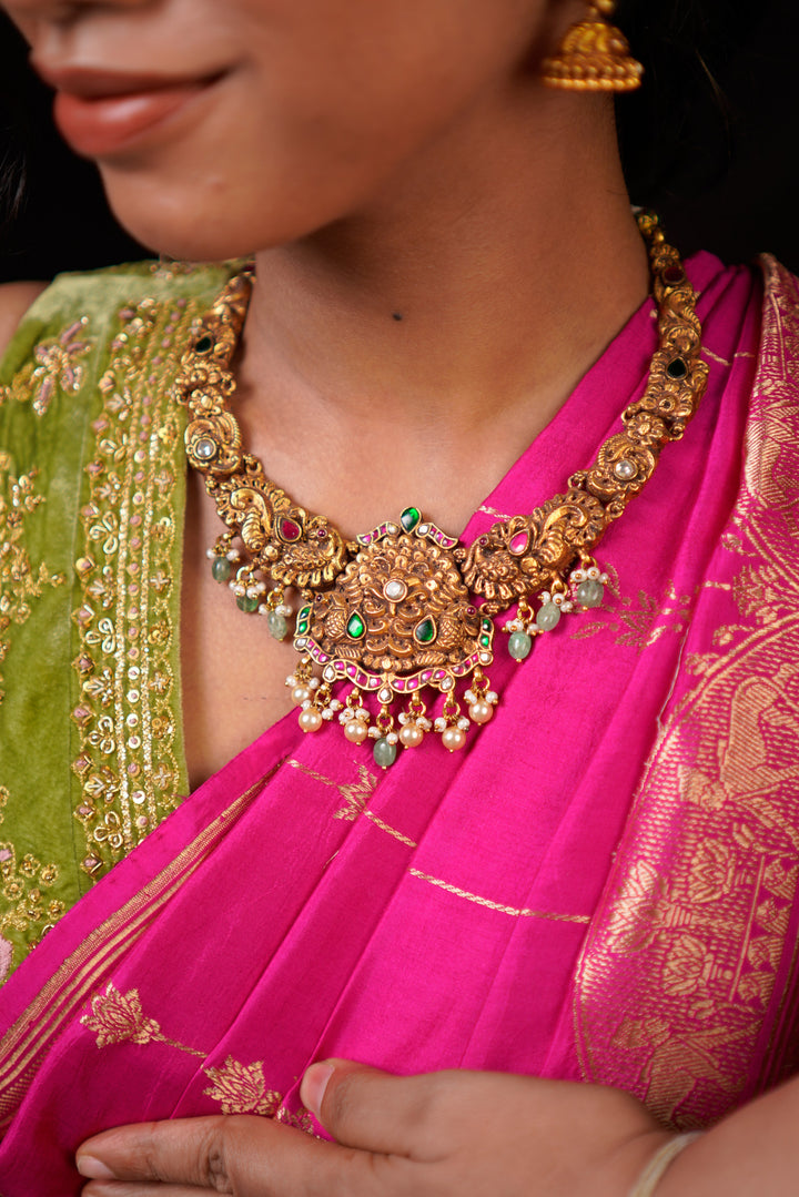 Divine Heirloom: The Traditional Temple Choker Necklace Adorn yourself with this magnificent Temple Choker Necklace, a true representation of South Indian artistic heritage. This piece is inspired by the elaborate, sculpted...