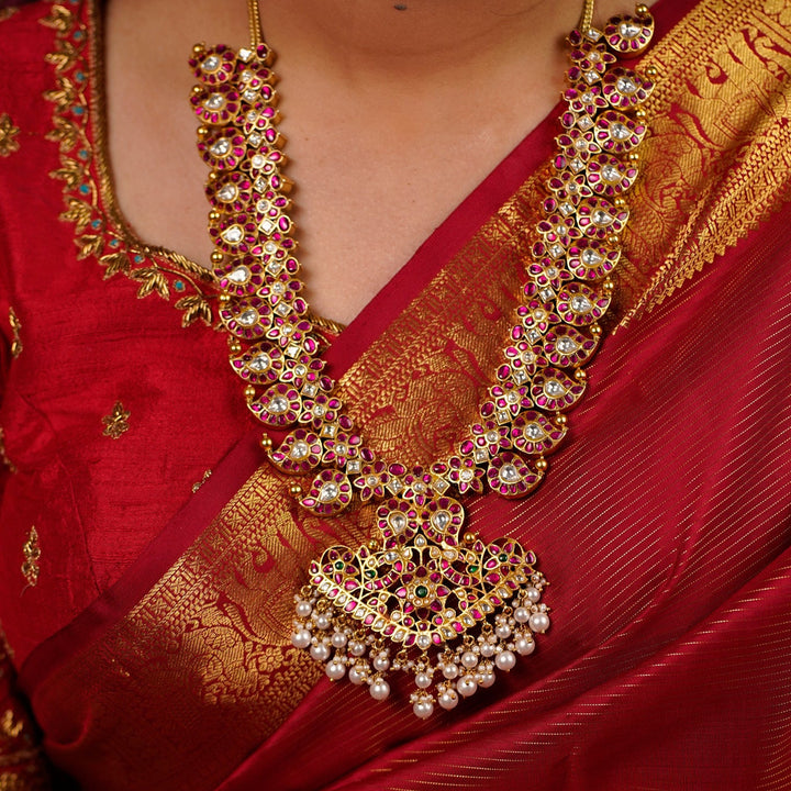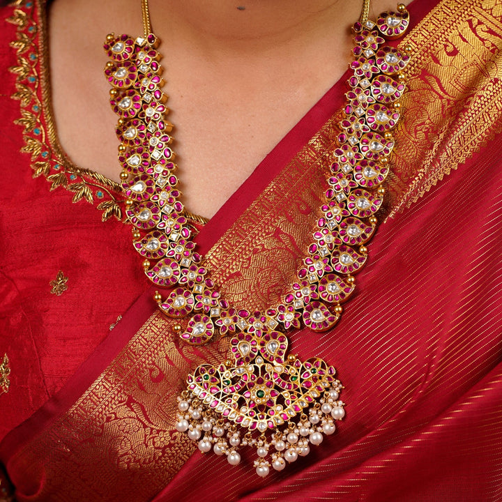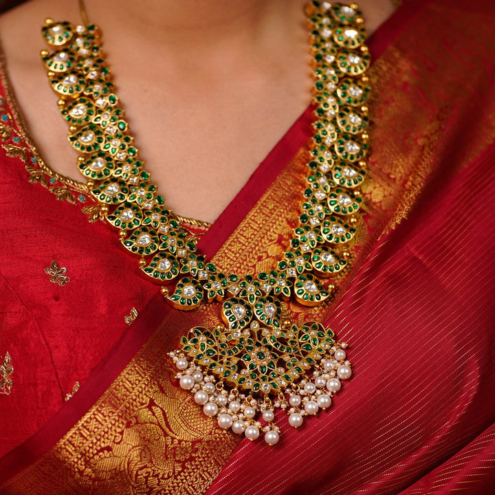 Experience the versatility and grandeur of traditional Indian jewelry with this magnificent Reversible Mango Maala. Crafted from high-quality 92.5 sterling silver and finished with a radiant 22-carat gold polish, this...