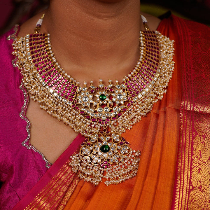 Make an unforgettable statement with this magnificent Bridal Heritage Kundan V-Neck Choker Necklace. This broad, majestic choker is the epitome of traditional Indian opulence, perfectly designed to frame the neckline...