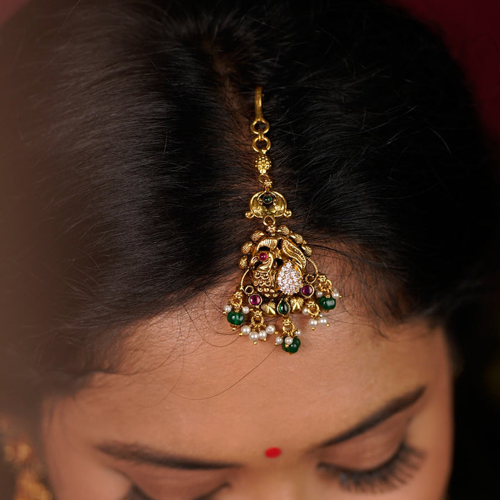 Adorn your look with the magnificent Vedika Peacock Temple Maang Tikka. This stunning piece is a beautiful fusion of traditional Indian temple jewelry art and contemporary craftsmanship. The centerpiece features...