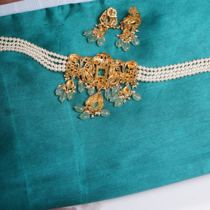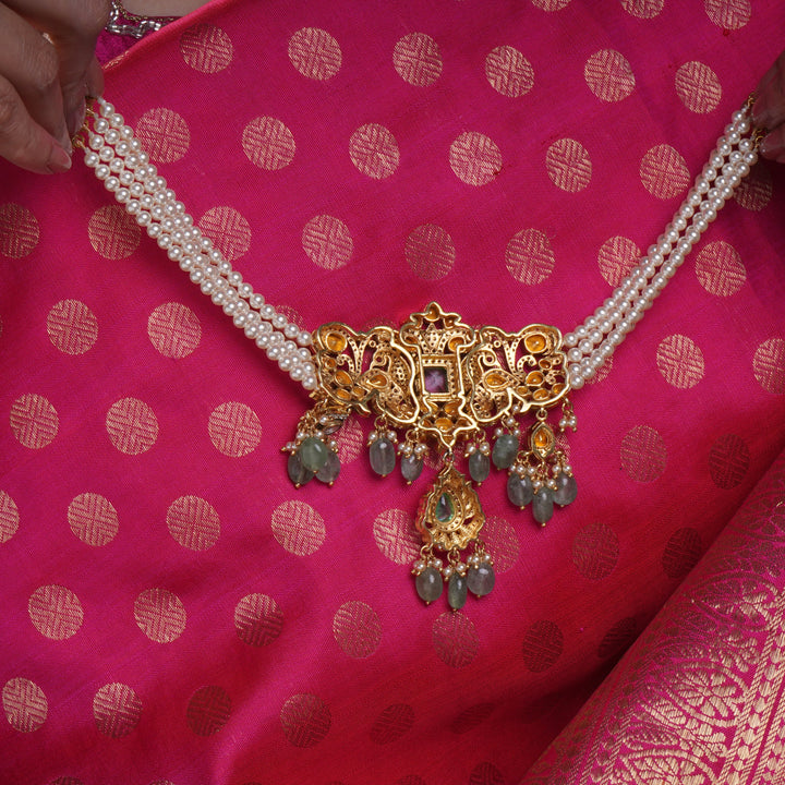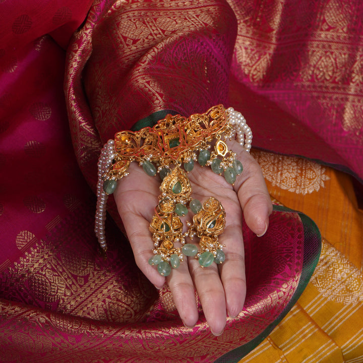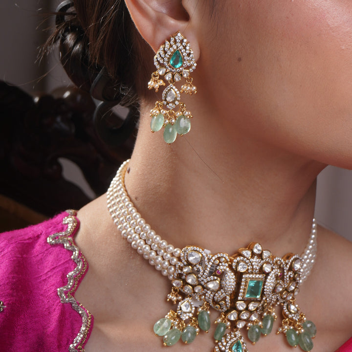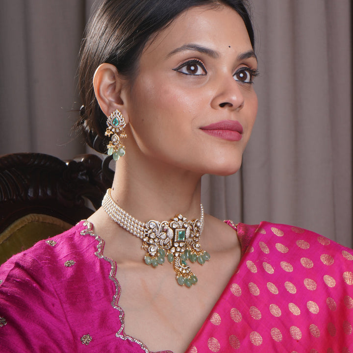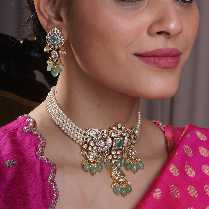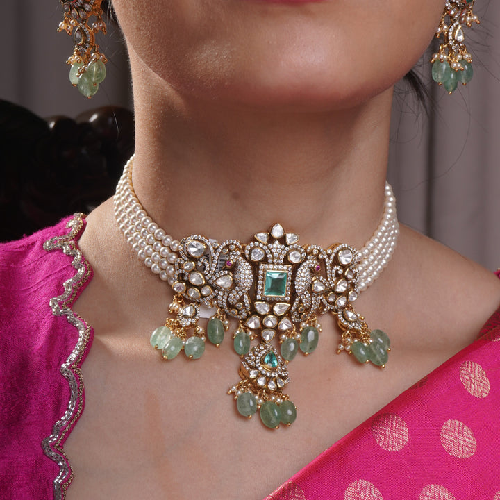 This intricately designed choker features dual side parrot motifs encrusted with sparkling zircon stones, symbolizing beauty and grace. At its center lies a striking emerald-green stone, surrounded by radiant moissanite...